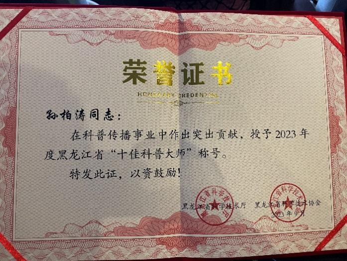 我所孫柏濤研究員榮獲2023年度黑龍江省“十佳科普大師”稱號