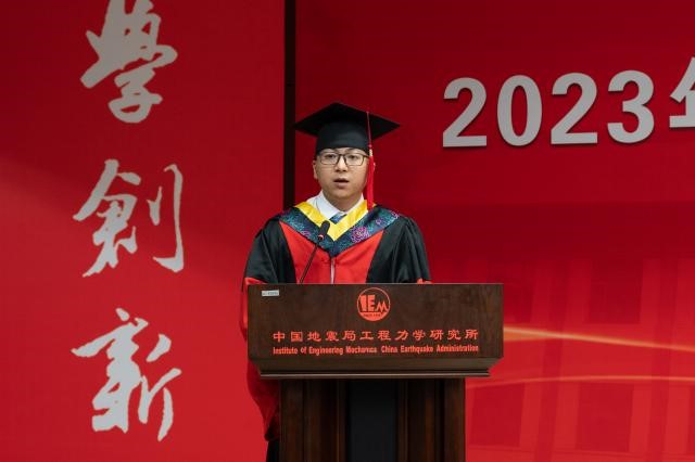2019級(jí)博士生沈俊凱代表畢業(yè)生發(fā)言。他表示會(huì)牢記所訓(xùn)精神,用工力所賦予的知識(shí)與智慧去創(chuàng)造美好未來(lái)。