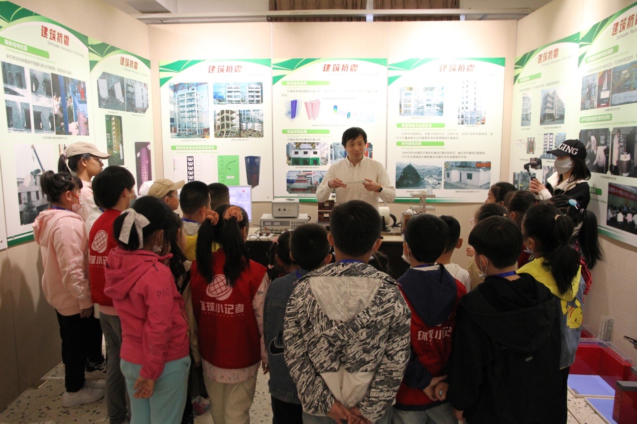 講座結束后,張昊宇副研究員帶領小記者們參觀并實踐了一系列的科普實驗。來到鐵路地震監測預警系統展臺,了解地震后該系統如何保障高鐵安全運行的原理。通過學習和思考,小記者們提出許多問題,例如“中國古建筑為何能夠跨越千年不倒”,張昊宇結合提問講解了中國傳統木結構的抗震機理知識。最受小記者們歡迎的還是微型振動臺模擬實驗和搖擺墻結構無損倒塌模型實驗。每一位小記者都親手操作搖擺墻結構無損倒塌模型,近距離直觀地認識到不同建筑結構抗震能力的強弱區別,學習了建筑結構抗震的基本知識。