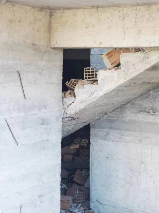 在本次地震現場觀察到的幾棟建筑的樓梯表現都不太理想,發生了梯段板斷裂、填充墻倒塌堵塞等,如圖1、圖2。其中圖1為新建建筑,可以看到明顯的梯段板斷裂。硬連接樓梯的作用類似斜撐,將受到比設計荷載大得多的地震內力,因此往往受到嚴重破壞,這在我國震害中也較為常見。近年來我國抗震規范對樓梯問題做了專門規定,提供了多種解決方案,將有效避免梯段板的破壞。