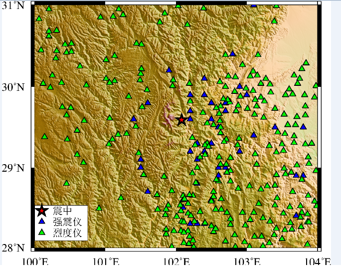 強(qiáng)震數(shù)據(jù)的收集與處理:震后第一時(shí)間收集了此次地震的強(qiáng)震儀與烈度儀數(shù)據(jù),臺(tái)站分布圖與震中分布圖詳見圖1。