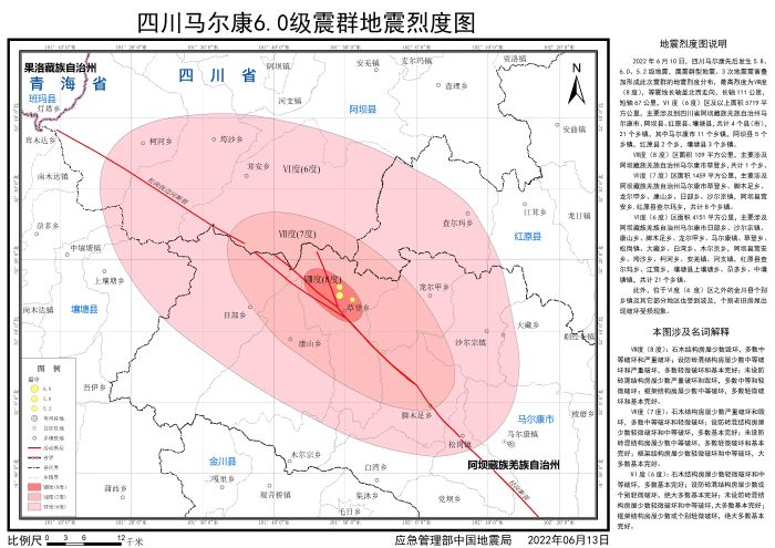 發布時間: 2022-06-22 點擊數量:57092022年6月10日,四川阿壩州馬爾康市先后發生5.8、6.0、5.2級地震,屬震群型地震。地震發生后,按照應急管理部部署,中國地震局組織四川省地震局開展應急處置工作,依照《地震現場工作 第3部分:調查規范》(GB/T 18208.3-2011)、《中國地震烈度表》(GB/T 17742-2020),通過災區震害調查,并綜合應用儀器烈度、地震構造背景、余震分布、震源機制、遙感影像等科技支撐成果,確定了此次地震的烈度分布,并依照《地震烈度圖制圖規范》(GB/T 38226-2019)編制完成《四川馬爾康6.0級震群地震烈度圖》。
