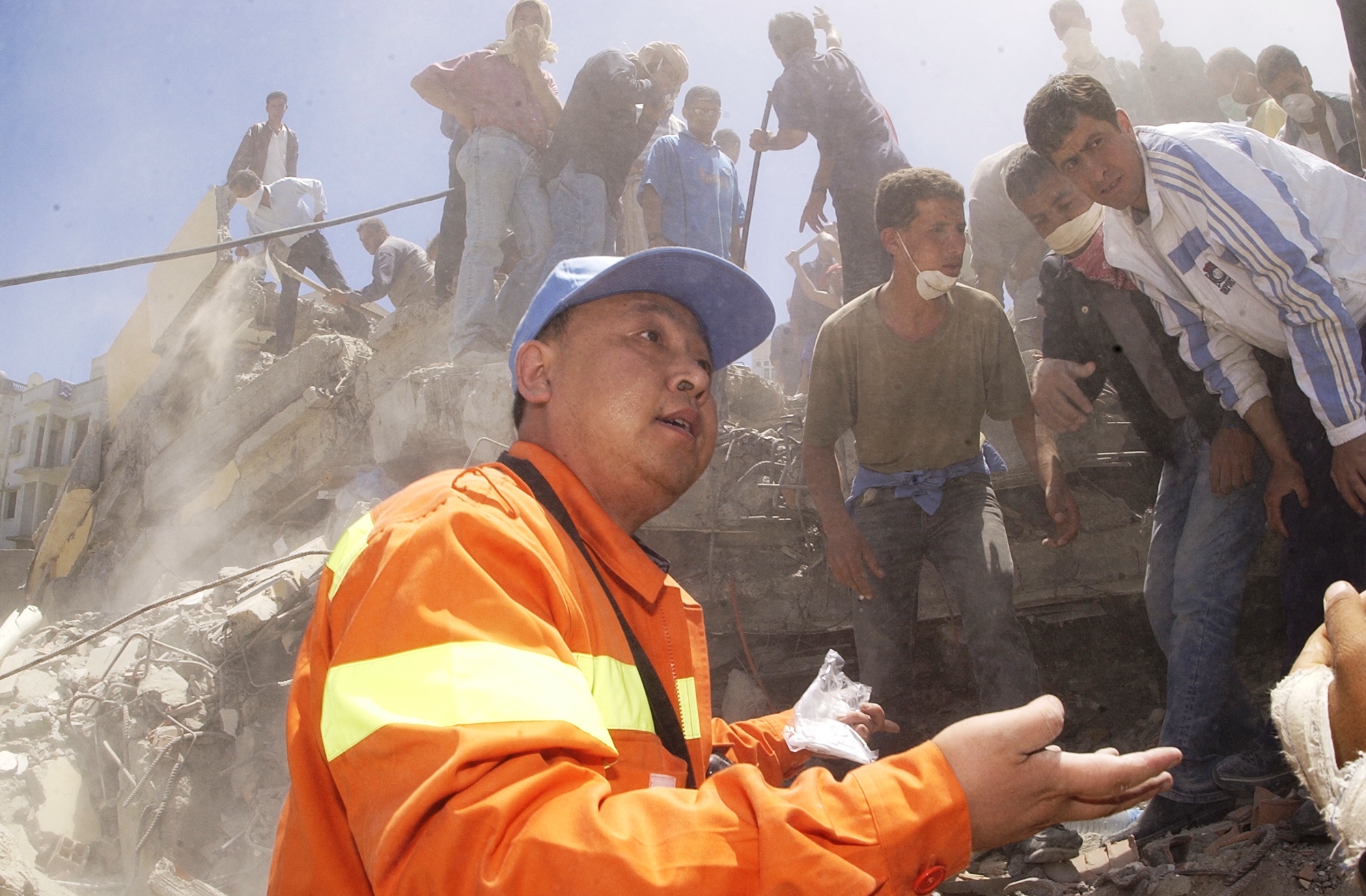 發布時間: 2023-08-02 點擊數量:6769走進位于哈爾濱市南崗區的中國地震局工程力學研究所(簡稱“工力所”),文化墻上的一幅照片格外引人注目:震后的斷壁殘垣間,深膚色卷頭發的救援人員圍住一位中國專家,他身穿橘黃色國際救援隊服,正全神貫注地講解著。這是工力所二級研究員、博士生導師孫柏濤,作為中國國際救援隊專家參與指導2003年阿爾及利亞地震現場救援的場景。