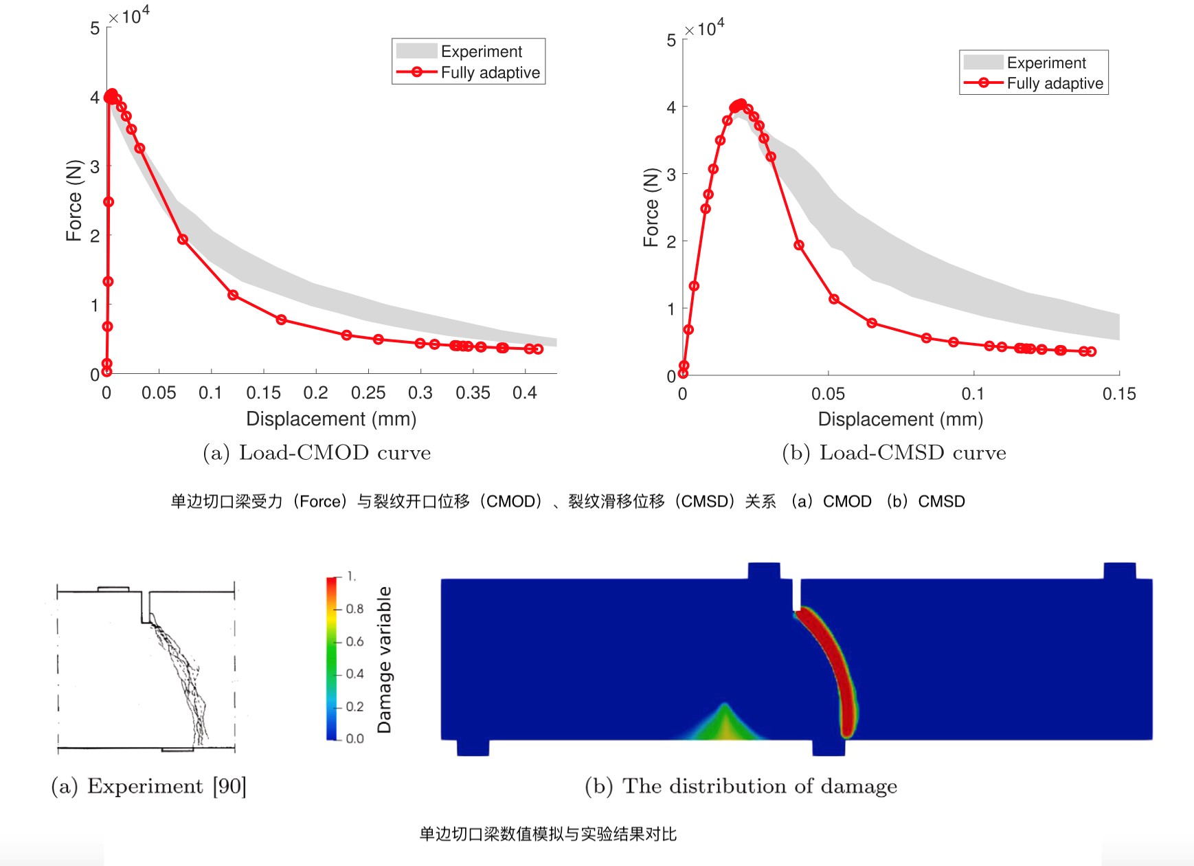論文提出了基于比例邊界有限元法的擬脆性材料靜力損傷演化模擬方法。采用積分型非局部損傷模型描述裂縫發(fā)展過程,有效緩解了損傷路徑對網(wǎng)格剖分的依賴問題;借助四叉樹自動劃分網(wǎng)格技術(shù),極大提高了損傷因子驅(qū)動的材料損傷區(qū)及鄰域網(wǎng)格細化效率;充分利用四叉樹網(wǎng)格的幾何相似性,顯著簡化了更新網(wǎng)格有限元矩陣的求解過程、以及新舊網(wǎng)格間單元變量的映射算法。最后,提出融合自適應網(wǎng)格劃分和自動荷載步的損傷全自動分析框架。通過對比已有算例(圖1,圖2)驗證了所提方法的準確性和有效性。