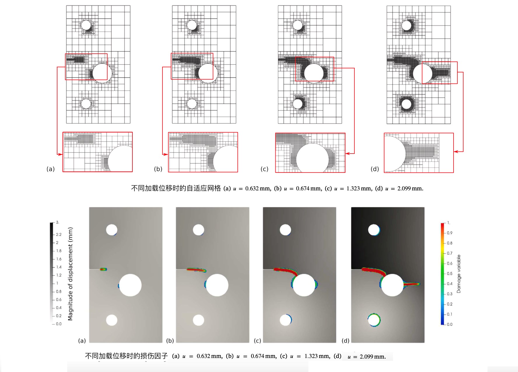 提出網(wǎng)格剖分和荷載步長自適應的擬脆性材料損傷演化算法,提高網(wǎng)格局部細化效率,減少非線性方程計算總步數(shù)。