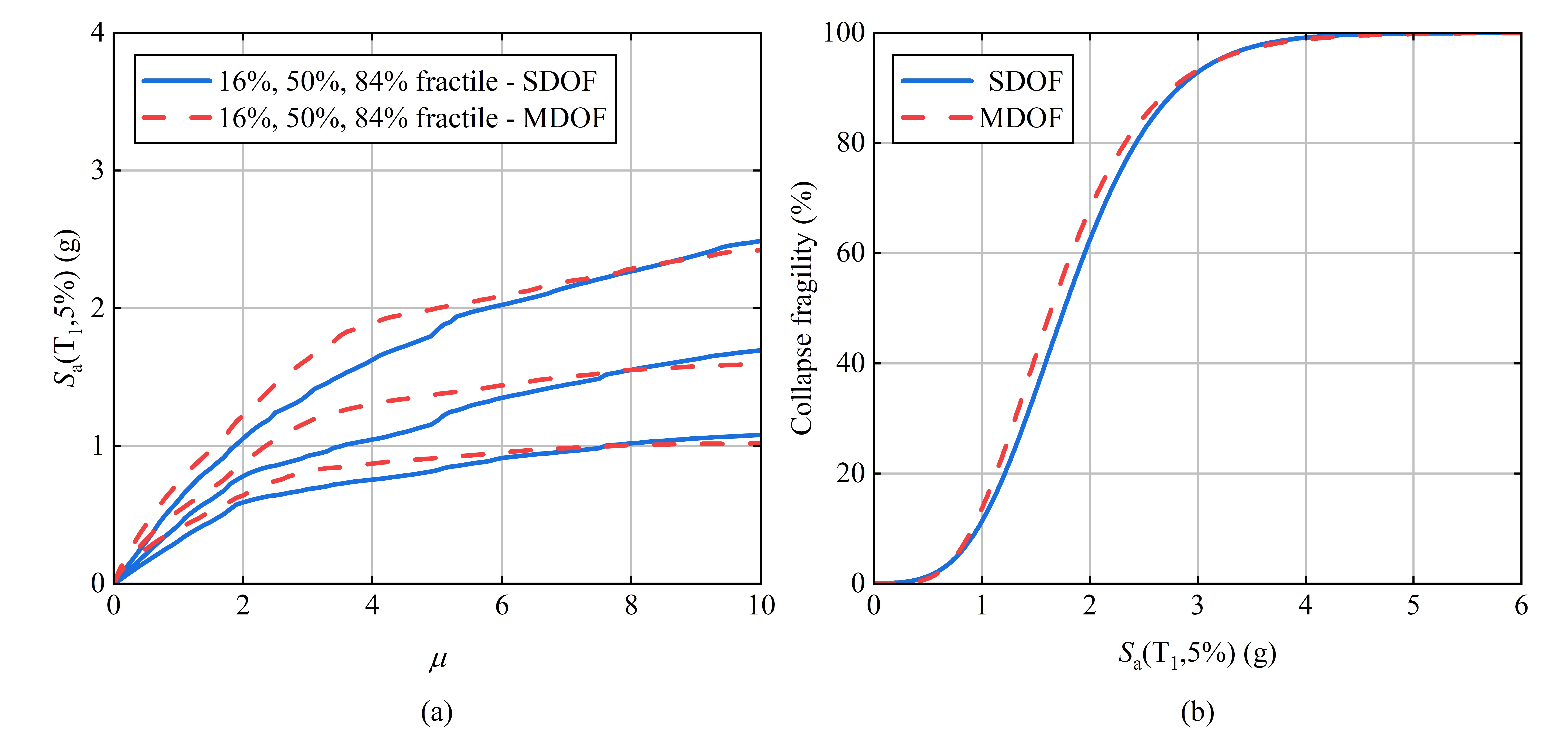 圖3 RC純框架結構(a)IDA曲線對比和(b)倒塌易損性曲線對比