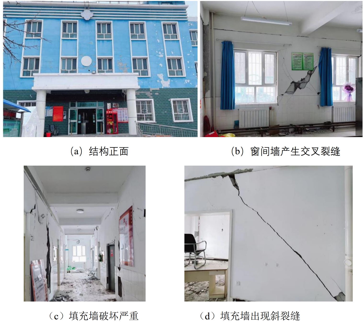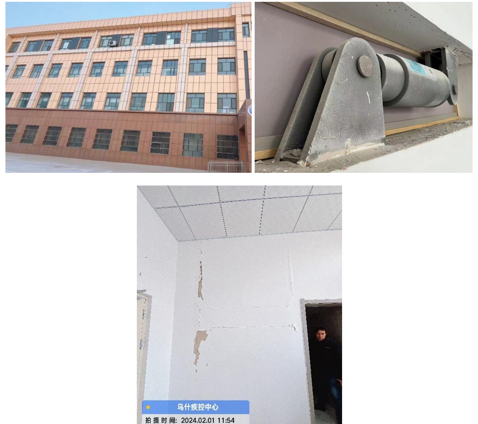 科考隊主要考察了Ⅶ度(7度)區內具有抗震設防的醫院、衛生院等建筑,主要包括框架結構、框架-剪力墻結構、消能減震結構以及早年建造的砌體結構。通過調查發現,框架結構的梁柱構件基本完好,部分填充墻與框架梁之間因變形不協調出現輕微裂縫,少數填充墻出現交叉斜裂縫;消能減震結構基本完好,阻尼器上、下剪力墻錯動導致剪力墻兩側填充墻抹灰層開裂。