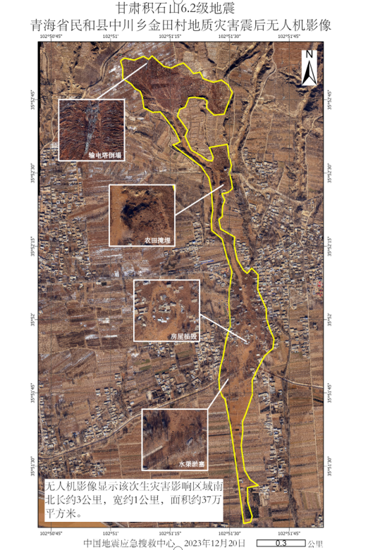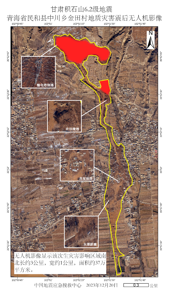 發(fā)布時間: 2023-12-25 點(diǎn)擊數(shù)量:69242023年12月18日23時59分,甘肅省臨夏積石山縣發(fā)生6.2級地震。此次地震已造成部分房屋損毀甚至倒塌,并由此造成人員傷亡。除房屋倒塌外,此次地震在青海省海東市民和縣中川鄉(xiāng)金田村和草灘村引發(fā)了被稱之為“砂涌”的特殊現(xiàn)象,區(qū)域內(nèi)部分房屋被厚達(dá)數(shù)米的流滑土壤掩埋(圖1)。