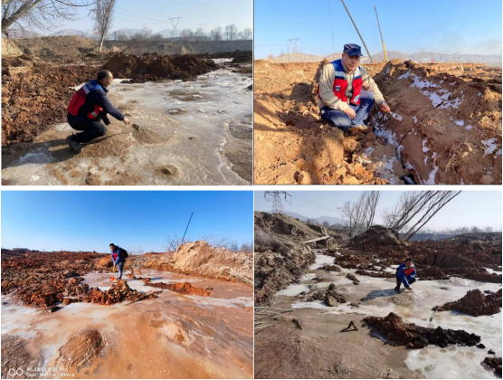 12月22日,在所領(lǐng)導(dǎo)的指示下,我所袁曉銘團(tuán)隊(duì)成立了專門的液化調(diào)查組,組長為陳龍偉研究員,組員聶桂波研究員、王永志研究員、汪云龍副研究員、李兆焱副研究員和張昊宇副研究員。于12月23日早奔赴地震現(xiàn)場,重點(diǎn)考察中川鄉(xiāng)的震害問題。12月24日,調(diào)查組經(jīng)過一天的艱苦調(diào)查,在此次地震流滑區(qū)上游發(fā)現(xiàn)了非常顯著液化現(xiàn)象(圖4),大規(guī)模液化分布在上游兩個區(qū)域內(nèi)(圖5)。結(jié)合考察組掌握的以往震害經(jīng)驗(yàn),判斷流滑區(qū)震害是上游發(fā)生大規(guī)模液化并導(dǎo)致長距離液化流滑所致,得出液化流滑是中川鄉(xiāng)震害誘因的結(jié)論,并向中國地震局甘肅積石山6.2級地震科考指揮部報(bào)告。