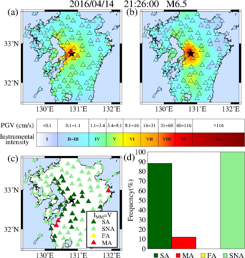 研究方法及結果: 1)我們提出了一個由RNN特征提取塊組成的混合深度學習網絡(PGV。模型采用單個臺站的多個物理特征時間序列、地震原始波形和場地特征PGV相關的信息。本研究利用日本2007-2019年記錄到的地震動記錄建立訓練集和測試集對1展示了HybridNet模型預測的現地PGV與地震潛在破壞(儀器烈度)之間的關系,通過對預測的