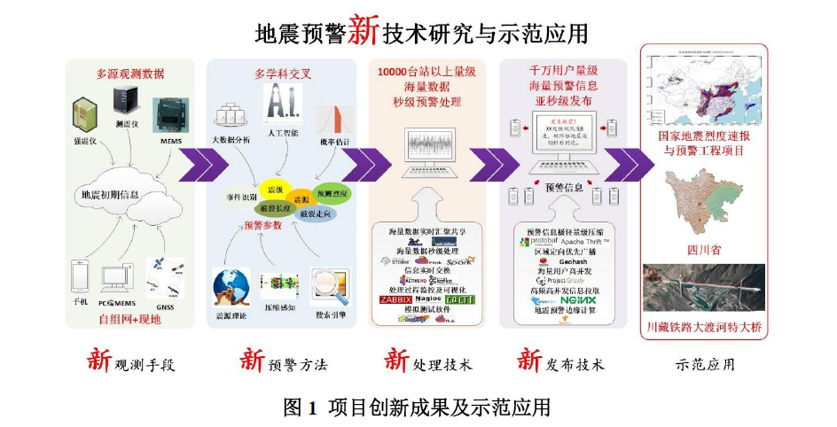 項目緊緊圍繞國家重大建設(shè)項目“國家地震烈度速報與預(yù)警工程”實施中亟待解決的關(guān)鍵科技問題,針對確定地震預(yù)警參數(shù)的“快和準(zhǔn)”問題和地震預(yù)警系統(tǒng)建設(shè)的技術(shù)需求,按照“理論研究—技術(shù)研發(fā)—系統(tǒng)研制—示范應(yīng)用”的一體化實施路線,基于人工智能、大數(shù)據(jù)分析等先進(jìn)新興技術(shù),通過3年多的科研攻關(guān),實現(xiàn)了“新觀測手段、新預(yù)警方法、新處理技術(shù)、新發(fā)布技術(shù)”的“四新”創(chuàng)新點,并在四川、云南、京津冀以及川藏鐵路成功進(jìn)行了示范應(yīng)用。