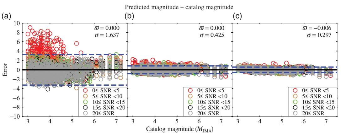 圖1 P波達到后3秒時,(a)τc方法、(b)Pd方法和(c)SVM-M模型的震級估計誤差與震級和信噪比的關系