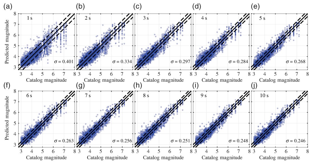 圖2 P波到達后1-10秒,基于SVM-M模型的單臺震級估計結果