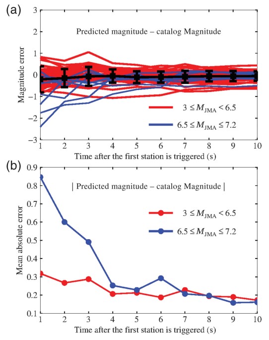 圖3 首臺觸發后,震級估計誤差與隨時間的演化