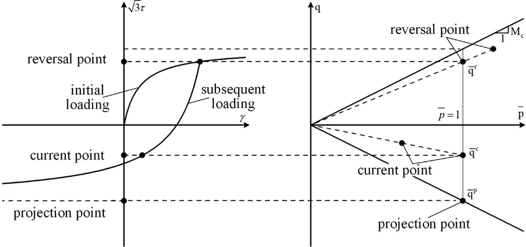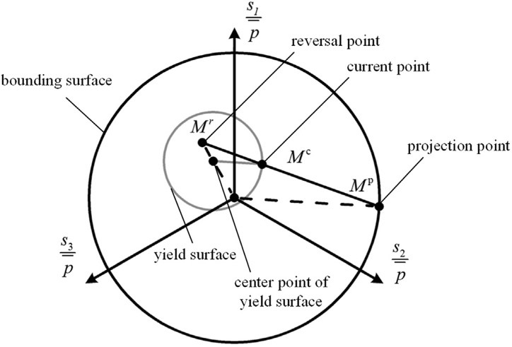 1.本文首先提出了一個(gè)便于工程應(yīng)用的三維土體彈塑性本構(gòu)模型。本模型基于邊界面模型理論,在歸一化偏平面中建立投影法則給出應(yīng)力狀態(tài)參量(見(jiàn)圖1);采用土體材料模量與圍壓的經(jīng)驗(yàn)關(guān)系描述圍壓改變引起的土體模量變化;并根據(jù)偏應(yīng)力不變量建立應(yīng)力等效關(guān)系,將一維Pyke模型拓展到三維應(yīng)力空間并以此推導(dǎo)塑形模量(見(jiàn)圖2)。
