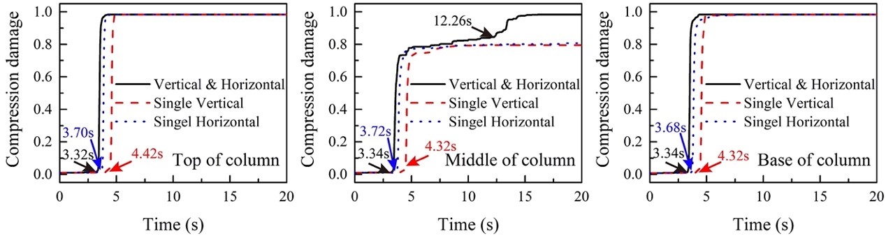 2.本文依據(jù)大開(kāi)車站的震害調(diào)查資料,建立三維非線性有限元模型(見(jiàn)圖3),采用時(shí)域動(dòng)力顯式有限元分析方法重現(xiàn)了大開(kāi)車站在雙向地震動(dòng)共同作用下的坍塌過(guò)程及其“M”型破壞模式(見(jiàn)圖4),給出了中柱混凝土實(shí)效演化過(guò)程(見(jiàn)圖5)。
