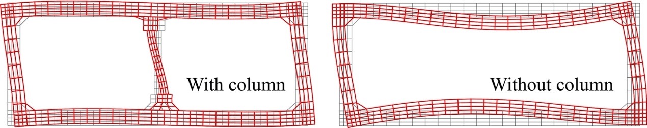 3.根據(jù)數(shù)值模擬得到的結(jié)構(gòu)變形演化過(guò)程(見(jiàn)圖6),可以將大開(kāi)車站的破壞分為三個(gè)階段:I)中柱在水平和豎向地震動(dòng)共同作用下失效;II)中柱承擔(dān)的上覆土和后續(xù)地震荷載向頂板轉(zhuǎn)移,并引起頂板混凝土損傷發(fā)育;III)頂板破壞沉降引起結(jié)構(gòu)整體垮塌。通過(guò)對(duì)比有無(wú)中柱截面的地震變形模式(見(jiàn)圖7),可知結(jié)構(gòu)幾何形狀(頂板和側(cè)壁的剛度比)對(duì)地下結(jié)構(gòu)的地震響應(yīng)有很大的影響;頂板的剛度大于側(cè)墻的剛度,有利于地下結(jié)構(gòu)的抗震。