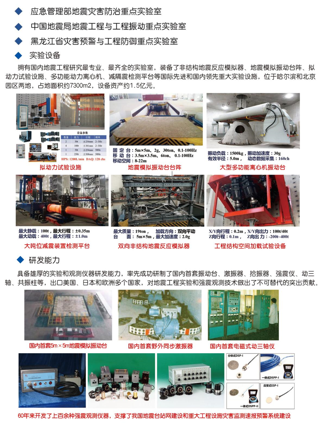 研究所在北京東燕郊設有科技園區,建有應急管理部地震災害防治重點實驗室、中國地震局地震工程與工程振動重點實驗室、黑龍江省災害預警與工程防御重點實驗室、黑龍江省防震減災工程技術研究中心,擁有國際先進、國內領先的地震工程綜合試驗系統。